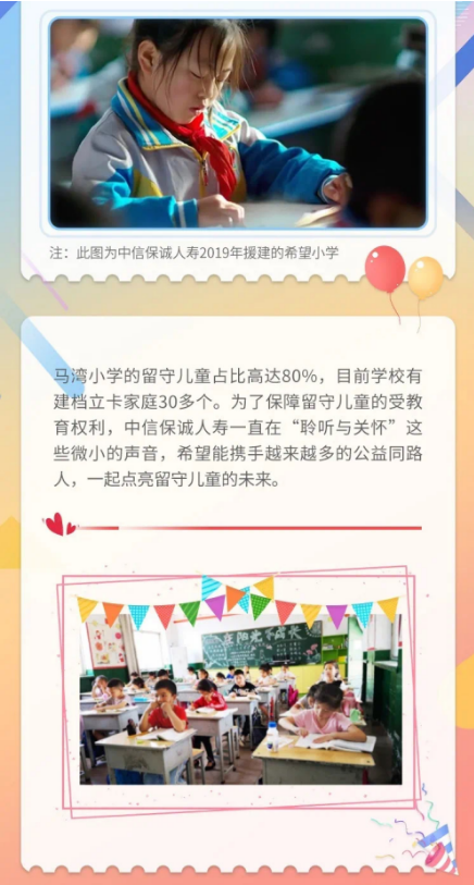 中信保诚人寿成立20周年推出“健行未来,Come on”公益马拉松活动,倡导读万卷书行万里路,通过成团捐赠微信步数,达成圆梦教育的公益目标,即助捐中信保诚人寿希望小学。