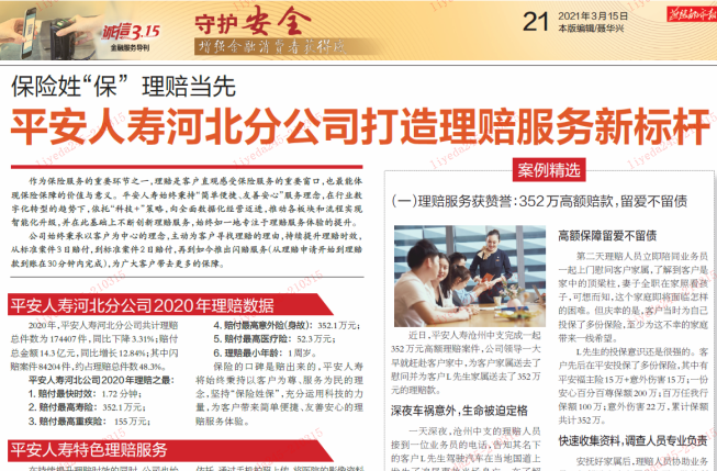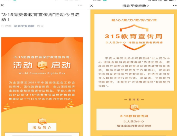 为全面落实2021年中国银保监会工作会议精神,不断加强金融消费者保护,强化消费者教育,全力维护经济金融安全和消费者合法权益,根据贵局《关于2021年银行业和保险业“3.15”消费者权益保护教育宣传周活动信息报送的通知》要求,我中支在全市范围内开展消费者权益保护教育宣传周活动,现将活动开展情况总结如下: 本次活动以线上线下教育相结合的宣传方式为主,考虑疫情防控工作的要求进行。 一、职场宣导 通过在中支及营销服务部职场悬挂条幅、摆放展架、张贴海报以及电视播放远离非法集资的宣传视频等形式,向全体内外勤员工、客户宣传今年3.15活动主口号“以人民为中心 增强金融消费者获得感”,并打出针对老年人群体系列口号“有温度的金融服务 护航幸福晚年”,为今年3.15活动营造良好的氛围。(我中支共制作条幅7条,展架10个,海报10张,广告机2台,电视1台)  二、外部媒体宣传 我中支在上级分公司统筹下,在燕赵都市报诚信3·15金融服务导刊版面发布《平安人寿河北分公司打造理赔服务新标杆》稿件,展现了我公司保险姓“保”理赔当先的服务理念。(稿件1篇)  三、社区宣导 3.15当天我中支进入社区通过拉条幅、发放宣传折页的方式,针对老年人群体,宣传反洗钱、防范非法集资等金融知识。老年人作为社会的弱势群体,容易受到欺骗,针对老年人进行宣传教育可以更好地维护他们的合法权益。(涉及客户100人次,发放各种材料200份)  四、开展3.15客户尊享会 我中支通过召开客户尊享会,组织客户DIY插花,并赠送小礼品,同时向客户宣传一些有用的保险小知识,提升客户整体服务体验。(涉及客户50人)  五、微信公众号宣传 通过分公司微信公众平台持续发布金融保险维权知识,推送“以案说险”风险提示的具体案例,并积极引导内勤员工进行转发,借助线上媒体渠道,影响身边的群众,提高消费者自我保护意识和风险防范能力。(目前累计阅读153次)