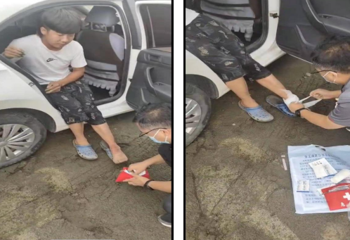 近日我司查勘员孟召印接到一起因驾驶员操作不当车辆坠河道的事故,因车辆坠落到河道内,车上人员在脱困时均不同程度划伤。查勘员赶到现场后看到两位伤者,其中一人脚踝部伤口较深又覆盖了大量淤泥,考虑出险地距离最近医院的路程也有30公里左右的距离,查勘员怕伤者伤口长时间搁置有感染的风险,便主动提出帮助伤者先进行简单处理,随后便拿出公司配备的紧急医疗包,给伤者进行了伤口清理、消毒、包扎。暖心的行为赢得了客户的认可与称赞。