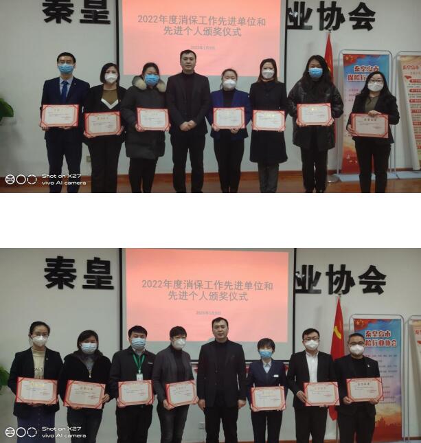 2023年1月9日下午,秦皇岛市保险行业协会举行2022年度秦皇岛保险业消保工作先进单位和先进个人颁奖仪式。 为切实保护保险消费者的合法权益,维护公平公正的金融市场环境,促进保险业高质量稳健发展,各会员公司做了大量工作,取得了一定成绩,也涌现出了许多热心于消保工作的先进单位和个人。为了褒扬先进,充分调动消保工作的积极性,进一步做好新形势下的消费者权益保护工作,经研究决定,授予10家先进单位和15名先进个人荣誉称号,并进行颁奖。 消保工作先进单位10个(排名不分先后) 中国人寿保险股份有限公司秦皇岛分公司 中国平安人寿保险股份有限公司秦皇岛中心支公司 中国太平洋人寿保险股份有限公司秦皇岛中心支公司 太平人寿保险有限公司秦皇岛中心支公司 中国人民财产保险股份有限公司秦皇岛市分公司 中国平安财产保险股份有限公司秦皇岛中心支公司 中国太平洋财产保险股份有限公司秦皇岛中心支公司 中国人寿财产保险股份有限公司秦皇岛市中心支公司 中华联合财产保险股份有限公司秦皇岛中心支公司 阳光财产保险股份有限公司秦皇岛中心支公司  消保工作先进个人15名(排名不分先后) 中国人寿保险股份有限公司秦皇岛分公司 陈海莉 中国平安人寿保险股份有限公司秦皇岛中心支公司 李莹 中国太平洋人寿保险股份有限公司秦皇岛中心支公司 袭丹 太平人寿保险有限公司秦皇岛中心支公司 王健光 新华人寿保险股份有限公司秦皇岛中心支公司 甘露露 中信保诚人寿保险有限公司秦皇岛中心支公司 于雅宁 合众人寿保险股份有限公司秦皇岛中心支公司 刘赫 农银人寿保险股份有限公司秦皇岛中心支公司 苏凤伟 中国人民财产保险股份有限公司秦皇岛市分公司 李志芳 中国平安财产保险股份有限公司秦皇岛中心支公司 吴建业 中国太平洋财产保险股份有限公司秦皇岛中心支公司 王洪斌 中国人寿财产保险股份有限公司秦皇岛市中心支公司 穆和祥 中华联合财产保险股份有限公司秦皇岛中心支公司 张玉杰 阳光财产保险股份有限公司秦皇岛中心支公司 陈玲 中国大地财产保险股份有限公司秦皇岛中心支公司 赵映