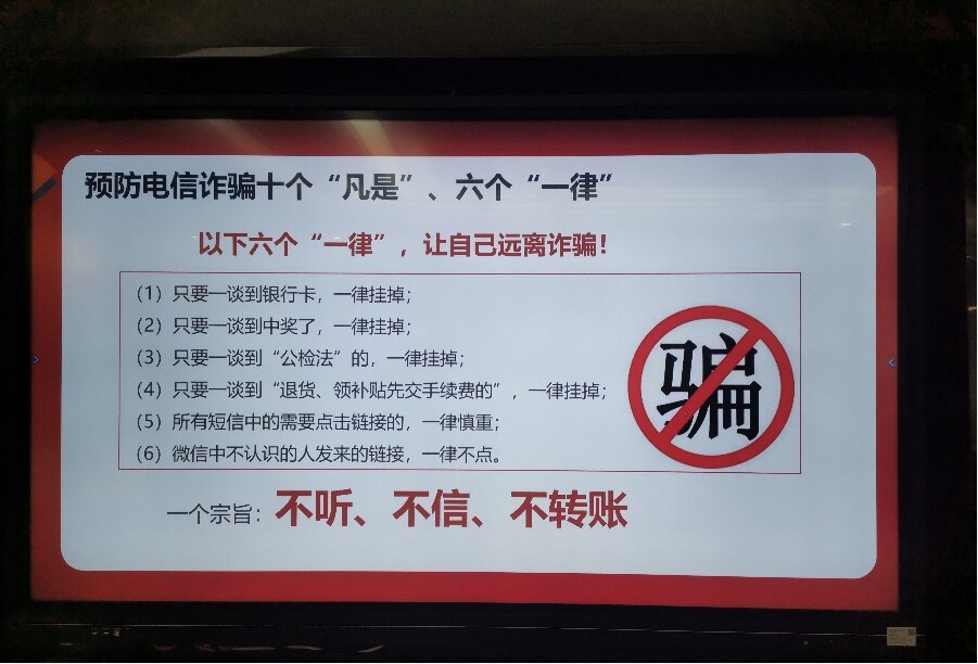 平安产险秦皇岛中支在柜面共享电子屏滚动播放预防电信诈骗知识,在宣传资料展架上均摆放了反诈宣传折页和海报,让每一位进入柜面的客户都能直观的了解反诈相关知识,提高风险防范意识。