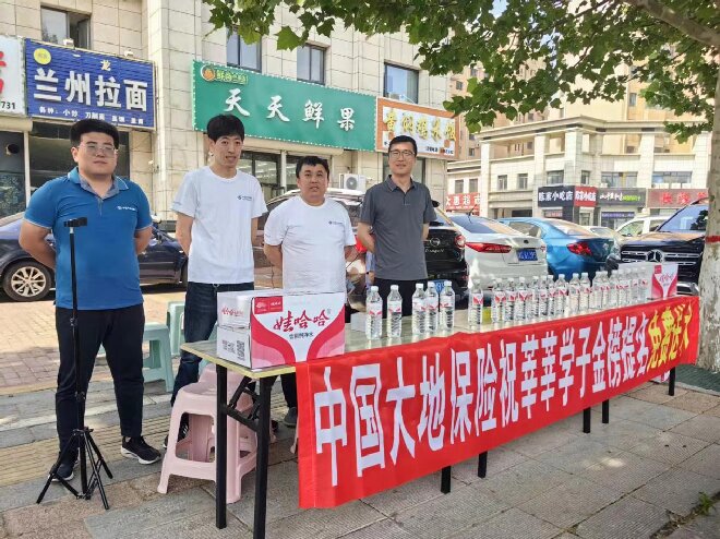 在昌黎一中考点,机构经理王杨带着本部员工为考生、家长发放饮用水,得到了学生以及学生家长的一致好评。机构经理王杨讲到:高考护航活动是中国大地保险贡献爱心,展现企业服务水平的平台,我们送给考生们的每一瓶水,每一支笔,每一个微笑,都是对莘莘学子的由衷祝福,希望他们能够在这样一个重要的日子里,考出理想成绩,考进理想大学。