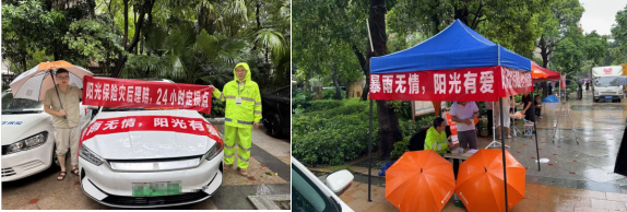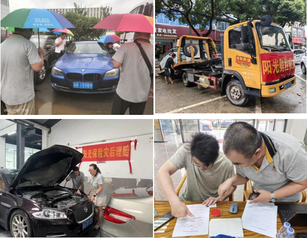 阳光财险泉州中支理赔员第一时间赶到现场 风雨中为客户查看车辆受损情况 利用查勘车上的拖车绳进行施救 成功协助客户脱困  “加把劲,赶紧转移物资” 9月8日上午9点 阳光财险广东分公司查勘员协助客户救援 垫高并转移被水浸泡物资 整理登记受损财产 及时、专业、热情的服务赢得客户赞赏