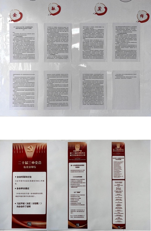 我司职场内宣传栏内宣传习总书记《关于<中共中央关于进一步全面深化改革、推进中国式现代化的决定>的说明》材料。醒目直观地进行党的二十届三中全会精神进行宣导。