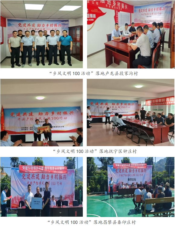 近期,平安产险秦皇岛中支以“党建共建 助力乡村振兴”为主题联合卢龙县段家沟村、昌黎县秦印庄村及抚宁区钟庄村开展“乡风文明100活动”暨乡村振兴党建共建活动。
