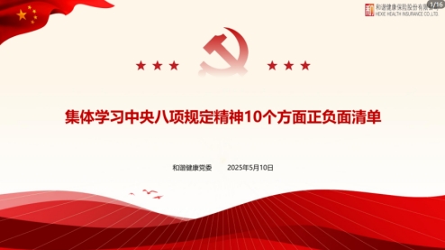 2025年5月10日,和谐健康秦皇岛中支全体党员按照总公司统一安排,开展5月党课学习。本次集中学习内容为:中央八项规定精神10个方面正负面清单。