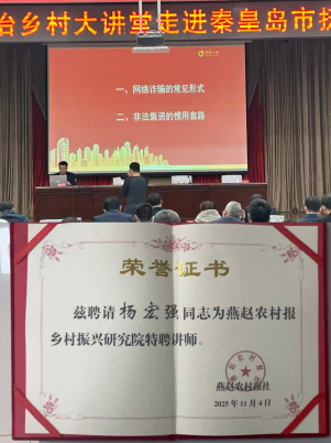 114日上午,中国人寿财险抚宁区支公司受燕赵农村报邀请参加由河北省农业农村厅、河北日报报业集团主办,燕赵农村报社、秦皇岛市抚宁区安全生产委员会承办的《河北法治乡村大讲堂暨河北乡村振兴战略百县大宣讲——走进抚宁》活动。抚宁区各政府机构主要负责同志115人、各乡镇街道分会场500余人参会。才汇斌经理参加会议,我司高度重视,精心准备宣讲课件,由农险杨宏强宣传金融安全风险防范,警惕网络诈骗,远离非法集资。宣讲后授予杨宏强“燕赵农村报乡村振兴研究院特聘讲师”证书。此次活动的参与,加大了防范网诈、非法集资的宣传力度,提升了社会公众的风险防范意识,发扬央企担当,宣传我司品牌,树立了良好形象,同时助力抚宁区的乡村振兴建设。