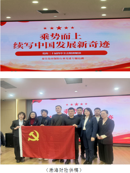 --以党建赋能保险高质量发展 2025年12月4日,为深入学习宣传贯彻党的二十届四中全会精神,落实党中央高质量发展决策部署,抢抓“十五五”规划战略机遇,渤海财险秦皇岛中支组织骨干人员参加行业协会举办的专题培训会。本次培训以“乘势而上,续写中国发展新奇迹——党的二十届四中全会精神解读”为主题,特邀秦皇岛市委党校刘勃教授主讲。 培训中,刘教授围绕全会公报核心内容,结合“十五五”时期经济社会发展目标,系统解读了高质量发展、科技自立自强、新质生产力培育等关键部署。他重点指出,“十五五”时期是基本实现社会主义现代化的关键阶段,保险行业需主动融入国家战略,在服务实体经济、民生保障等领域彰显担当,为参会人员找准党建与业务融合切入点提供了清晰指引。 参会人员认真聆听、深入思考,围绕“如何将全会精神转化为发展动能”展开交流。大家一致认为,全会精神为保险行业发展指明了方向,“十五五”规划中现代化产业体系、绿色发展等部署与财险业务高度契合。 下一步,渤海财险秦皇岛中支将以此次培训为契机,深化理论武装,通过“三会一课”等形式常态化学习全会精神;强化党建引领,设立党员先锋岗,推动党建与业务同谋划、同落实;聚焦服务实效,在科技保险、绿色保险、普惠保障等领域创新发力,优化服务流程,将学习成果转化为服务地方经济社会高质量发展的实际成效,以保险力量续写发展新奇迹。