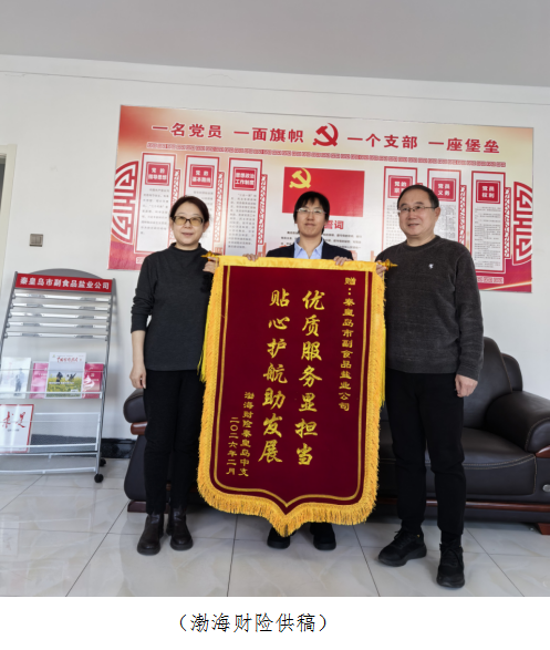 年来,秦皇岛市副食品盐业公司始终主动靠前、贴心服务,高效解决办公配套、设施维护、安全管理等各类需求,以责任担当与务实举措为我司经营发展保驾护航。此次赠旗既是感谢,更是对双方良好合作的肯定。未来,渤海财险秦皇岛中支将继续携手秦皇岛市副食品盐业公司,深化协作、共守安全、共谋发展,以更稳健的运营与更优质的服务回馈信任与支持。